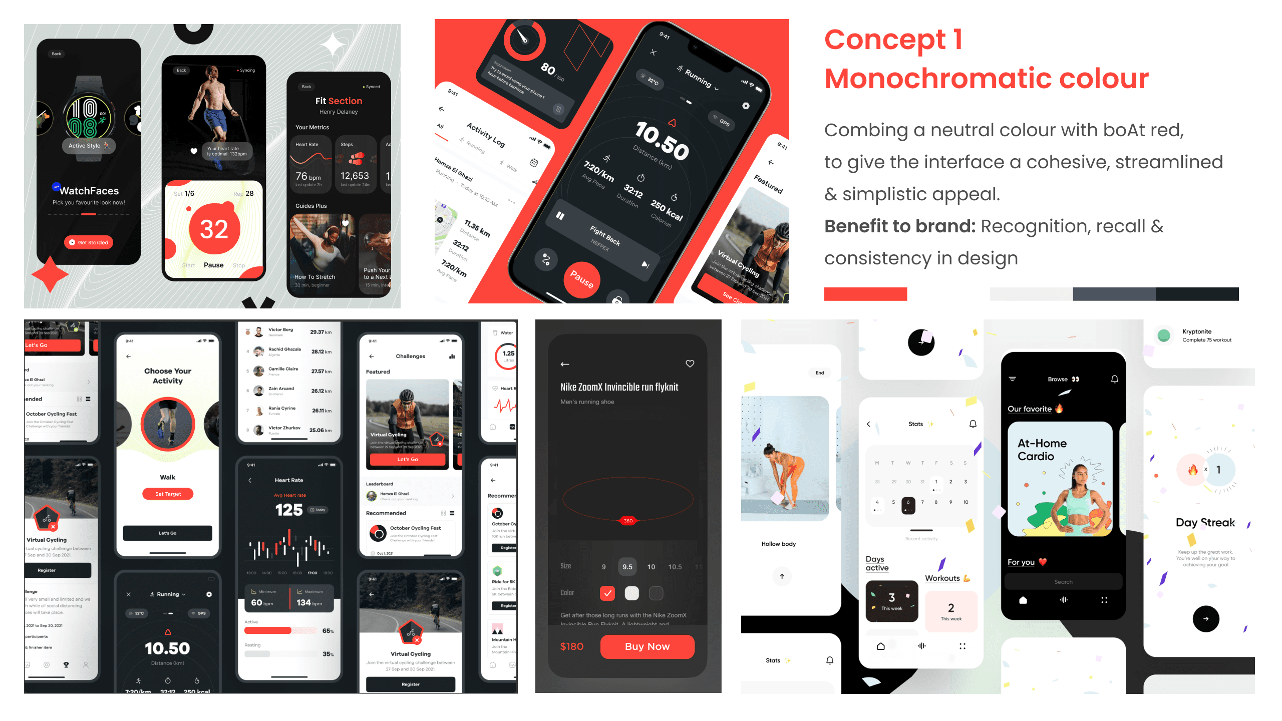 The visual language was designed to feel motivating without being loud. A dark-mode-first approach reduced visual fatigue, while typography and spacing carried most of the brand expression. Color and contrast were used sparingly to guide attention rather than decorate screens.